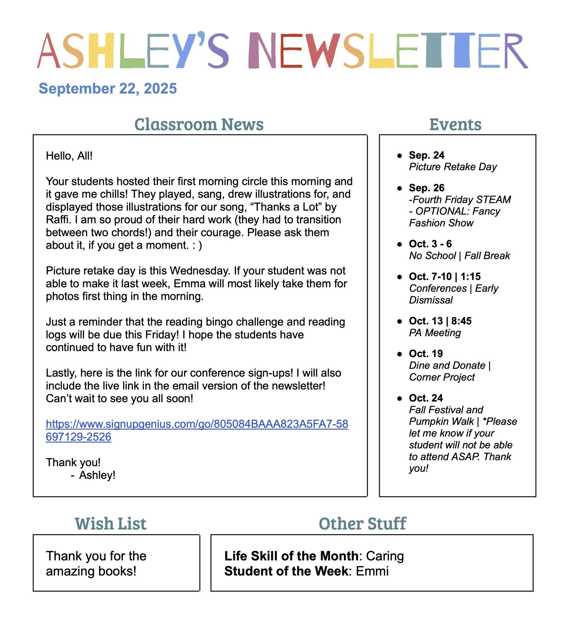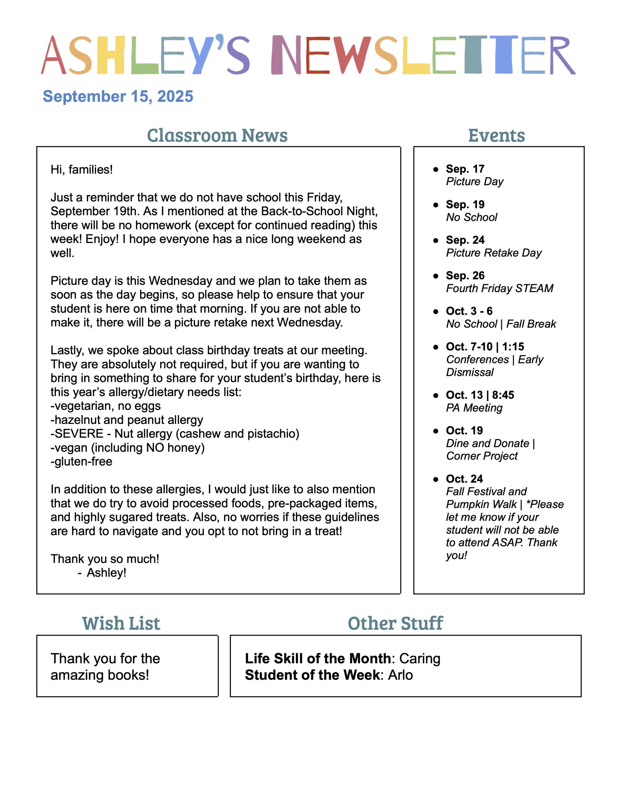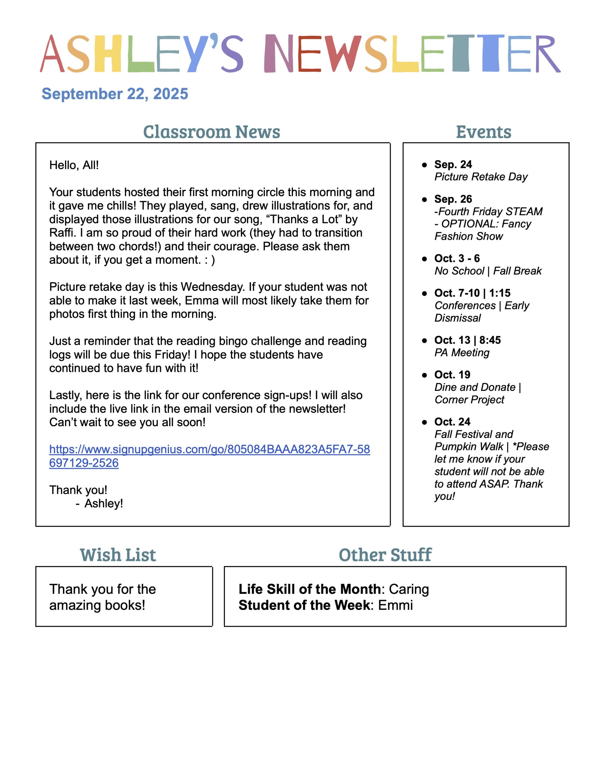 We have a wish list on Amazon for books for our classroom! If you would like to contribute, every little bit will help! Thank youl lam posting the actual web address here, but the link will be in the class emaill