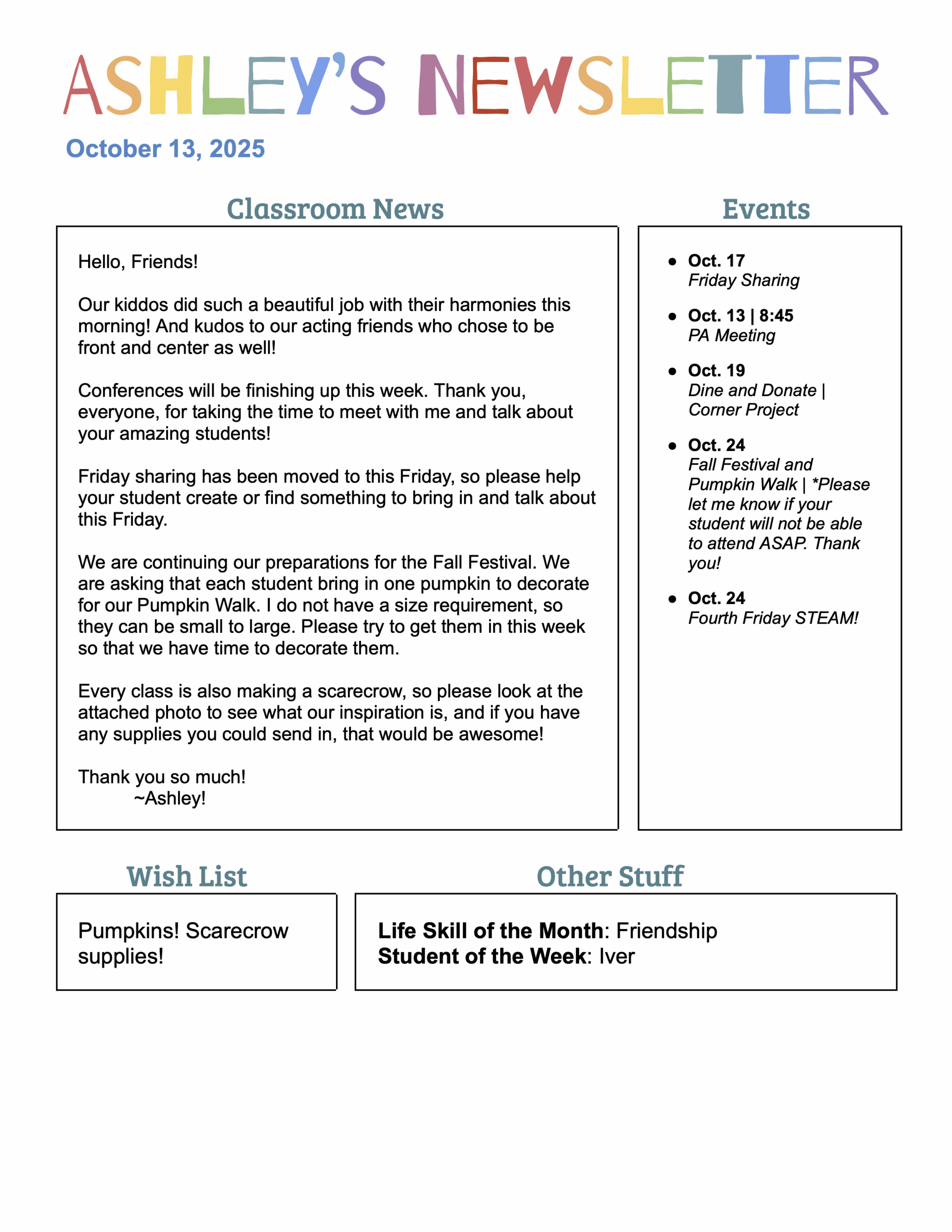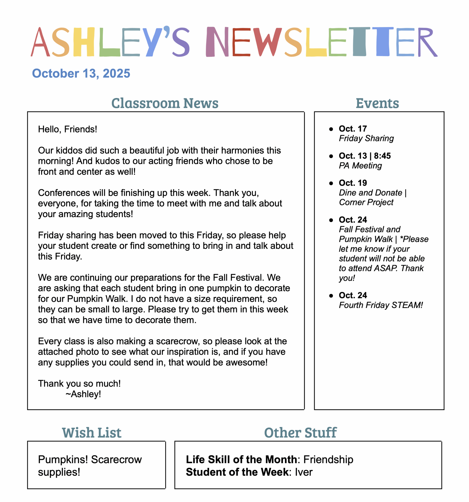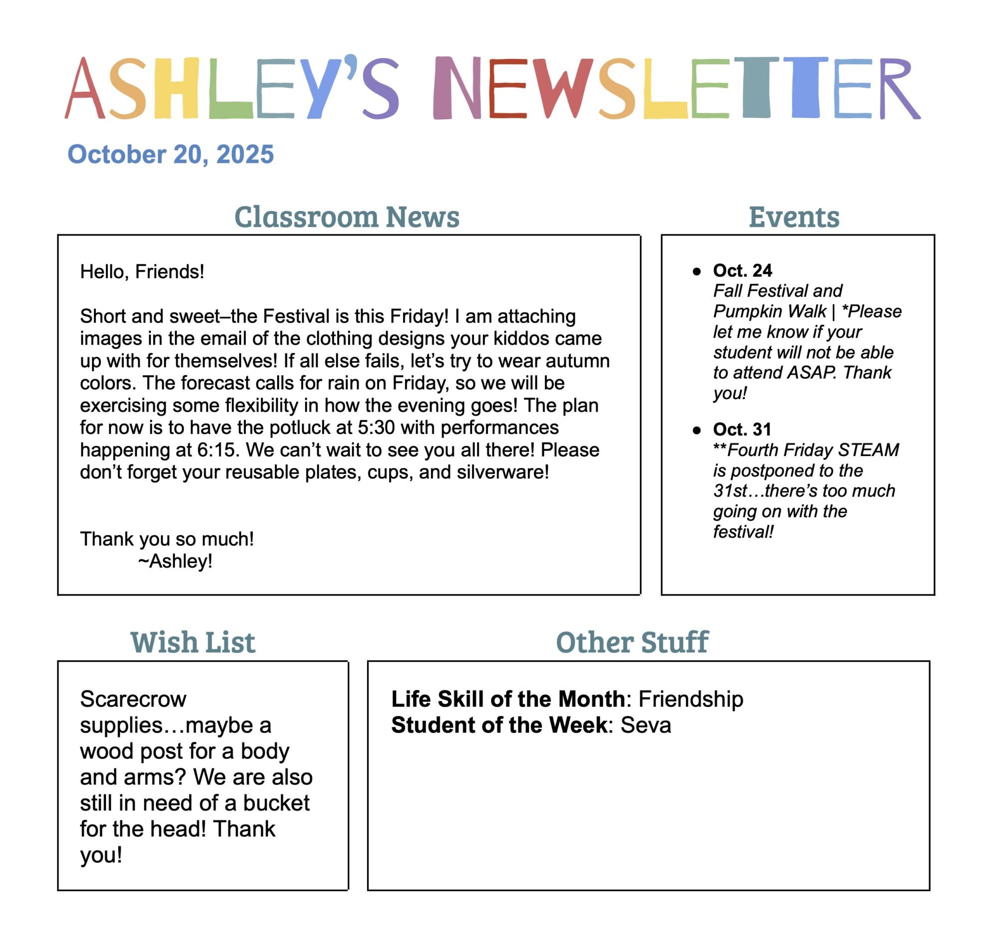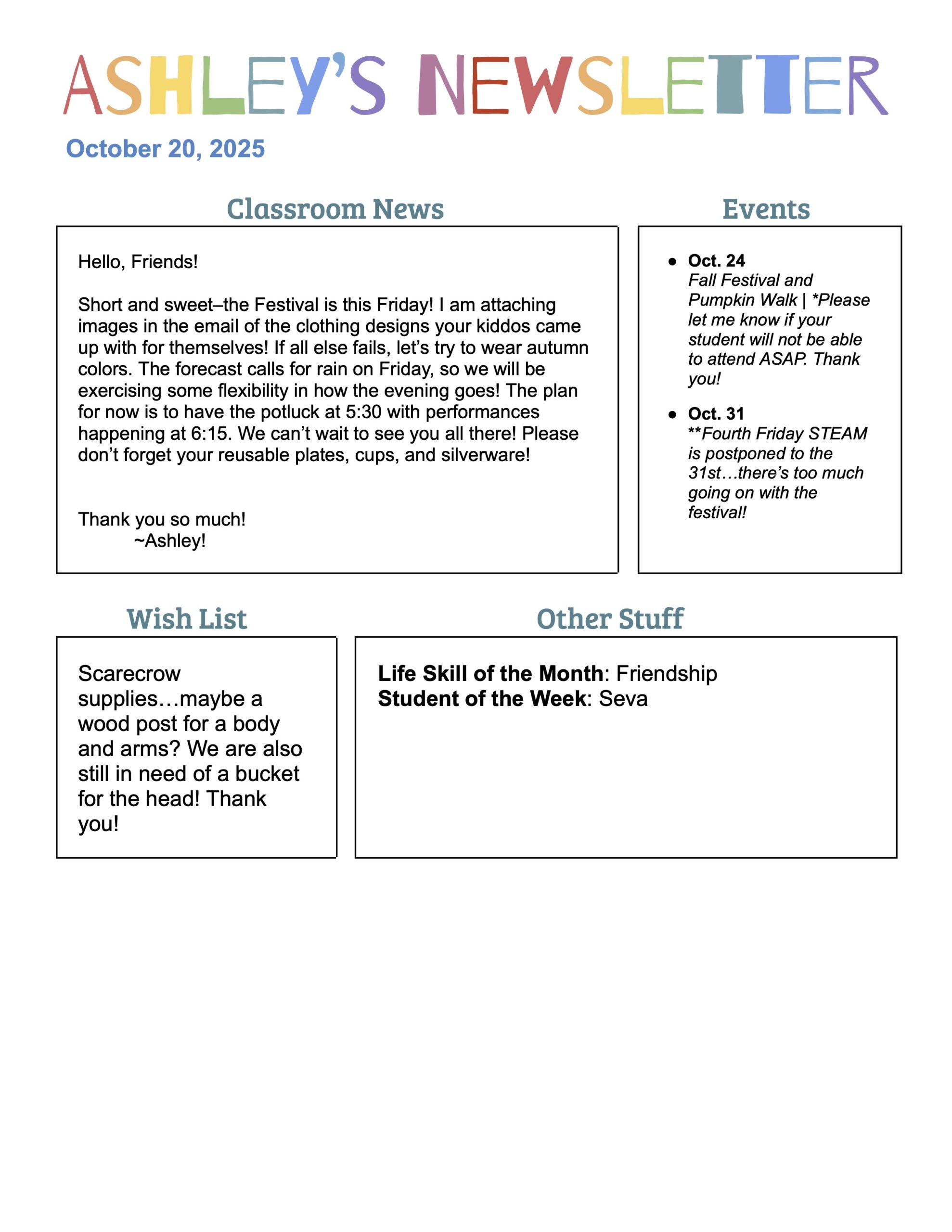 I am so excited to be your student’s teacher this year! My first official Newsletter will head home with your student on Monday, August 25th, but I just wanted to give you a little information for the first days of school. The students do not need much, just plenty of food to sustain them through the day, a reusable water bottle, and a bag to hold those items on a backpack hook outside the classroom. We do not have cubbies, so all items will need to hang on the hooks. This first week will be all about getting to know our new class, so I’m hoping it will be fun for all!